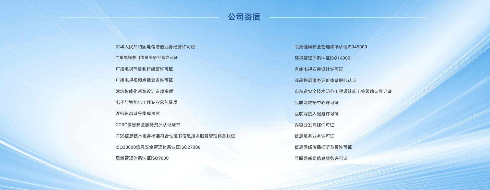 中國廣電山東網(wǎng)絡(luò)有限公司(原山東廣電網(wǎng)絡(luò)有限公司,成立于2001年,2021年6月更名)是全省唯一一家具備廣播電視傳輸和集成式播控服務(wù)、通信全業(yè)務(wù)服務(wù)及綜合文化信息服務(wù)的省屬國有重要骨干文化企業(yè),具有意識(shí)形態(tài)、公共服務(wù)和技術(shù)產(chǎn)業(yè)三大屬性,主要負(fù)責(zé)山東省內(nèi)廣播電視網(wǎng)絡(luò)和智慧廣電業(yè)務(wù)的規(guī)劃、建設(shè)、運(yùn)營和管理,廣播電視節(jié)目制作、編輯、采集、經(jīng)營及廣播電視節(jié)目傳送業(yè)務(wù)等,擁有32萬公里有線電視傳輸干線和5G 700M、4.9GHz 頻譜、192號(hào)碼段等資源。作為黨媒政網(wǎng),公司始終堅(jiān)持以人民為中心,把黨和政府的聲音第一時(shí)間傳遞到千家萬戶。目前,公司已建成覆蓋省市縣鄉(xiāng)村五級(jí)的有線傳輸網(wǎng)絡(luò)和統(tǒng)一智能的技術(shù)平臺(tái),擁有直到村一級(jí)的服務(wù)體系,下轄16家市級(jí)公司,143家縣(市、區(qū))公司和19家控股子公司,資產(chǎn)規(guī)模、用戶數(shù)量和經(jīng)營總量位居全國同行業(yè)前列。公司兩次榮膺全國“文化企業(yè)30 強(qiáng)”,榮獲“全國文化體制改革先進(jìn)單位”山東省“省級(jí)文明單位”“重合同守信用企業(yè)”“工人先鋒號(hào)”“山東省文化創(chuàng)新獎(jiǎng)”等榮譽(yù)稱號(hào)。